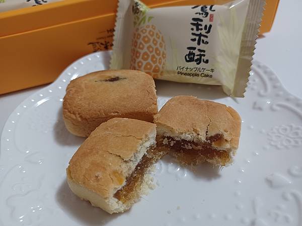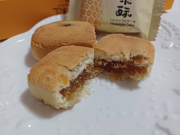 他們家的鳳梨酥外皮相當酥軟,看我切成兩半後,外皮有著明顯龜裂痕跡。
